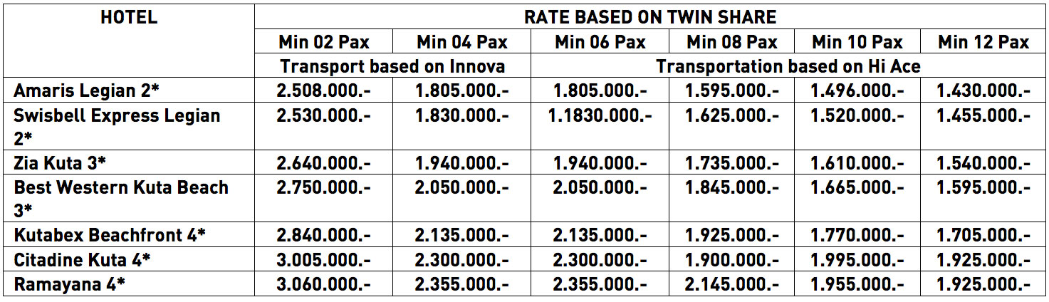 • Diasumsikan pesawat tiba di Denpasar Bali makasimal pukul 10.00 WITA, agar mendapatkan waktu yang panjang dalam menjalankan tour di hari pertama.